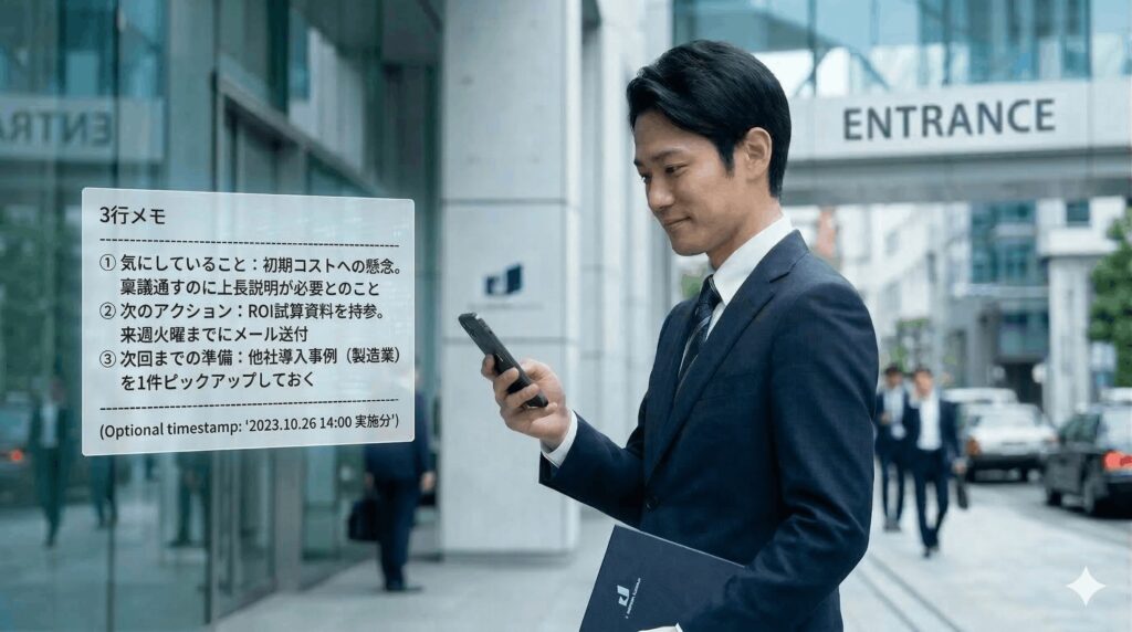 - 担当者なら、商談後の3行メモで「次の一手」を明確にする