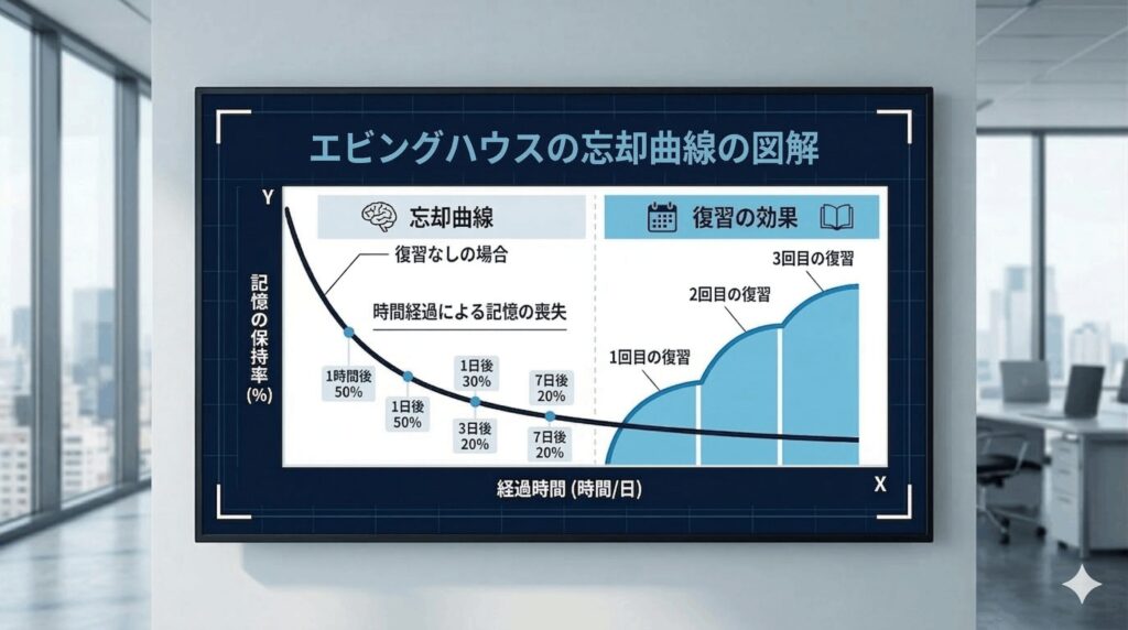 (※無意味な音節を用いた実験に基づく数値であり、意味のある商談内容の記憶とは異なりますが、時間の経過とともに記憶が早い段階で薄れるという傾向は広く確認されています)